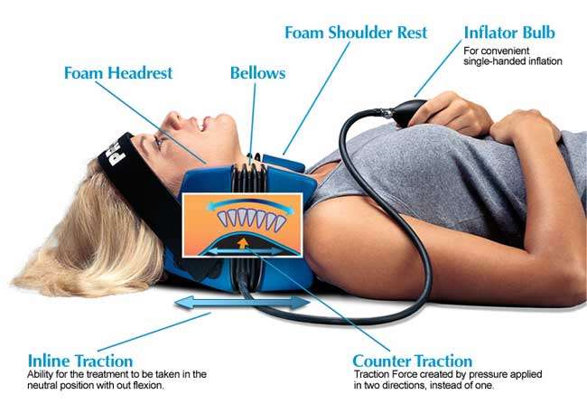 Un fuelle inflado por aire entre los cojines proporciona hasta 35 lb (16 kg) de tracción ajustable continuamente. A medida que el fuelle se expande, levanta la cabeza hacia arriba, apoyando la curva cervical y manteniendo una distracción uniforme en los discos cervicales anterior y posterior.